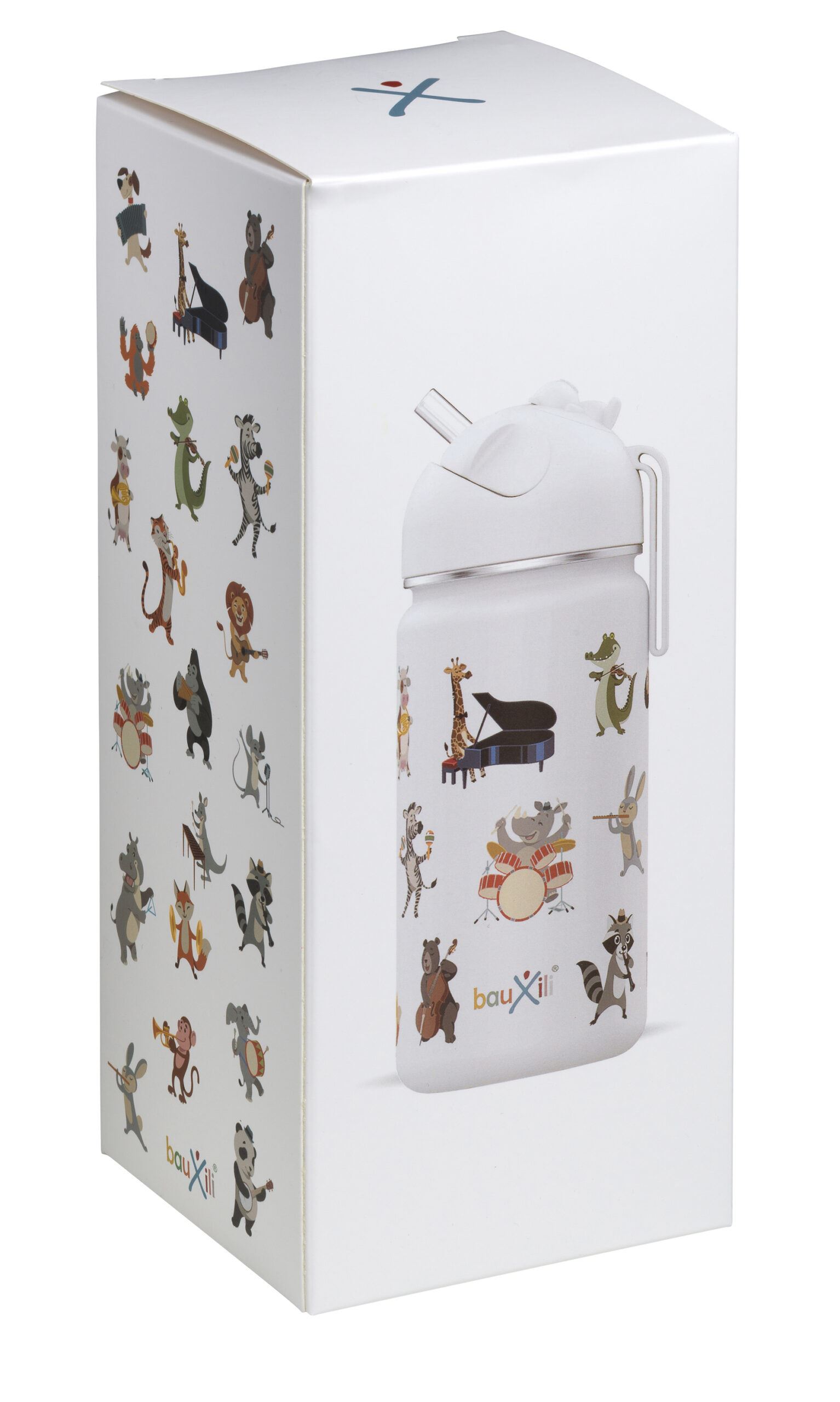 Odkrijte stekleničko za vodo Bauxili – zabaven in praktičen dodatek za vsakega otroka! Ta steklenička za vodo iz nerjavečega jekla prikazuje različne risane živali, ki igrajo na glasbila in spodbujajo ustvarjalnost in domišljijo.