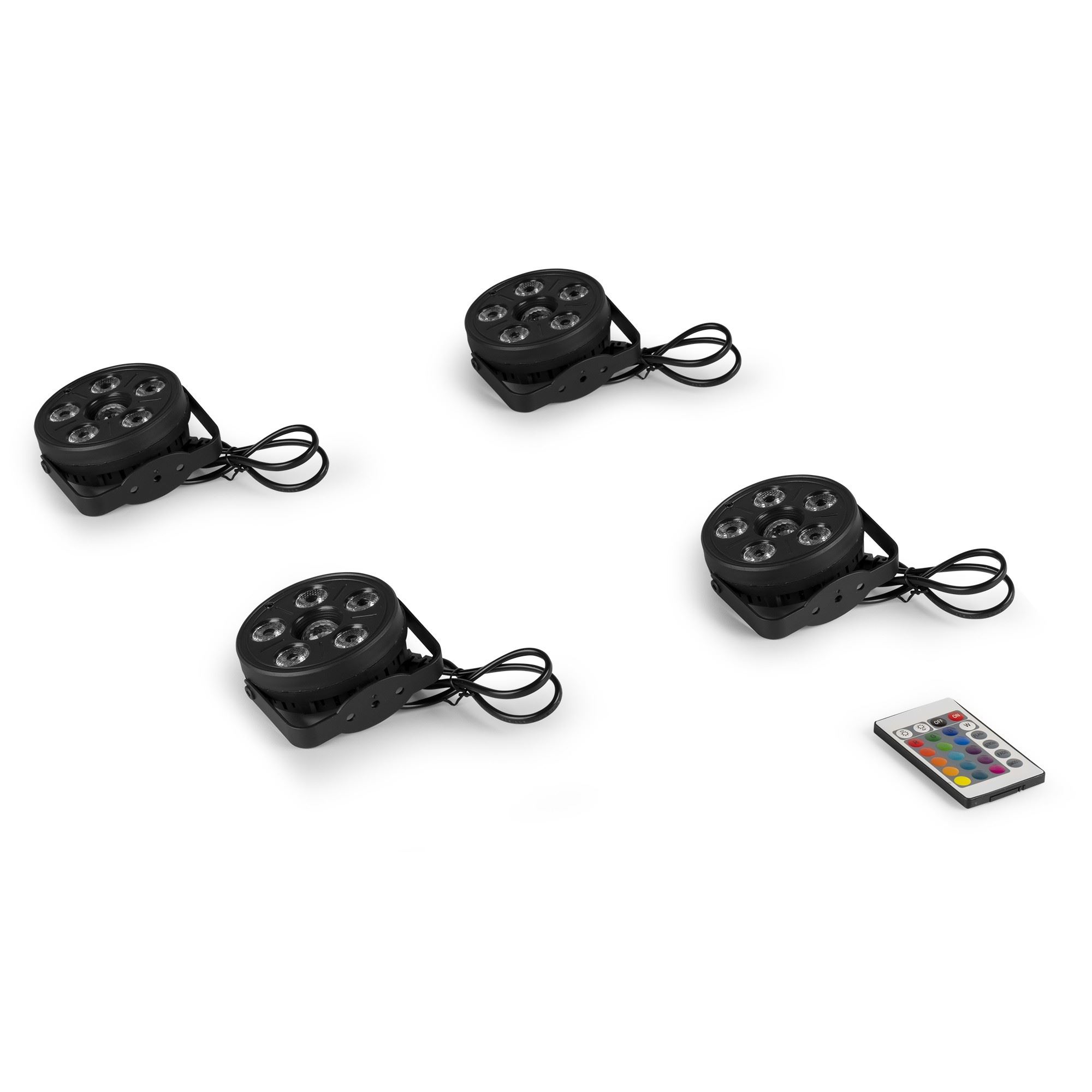 Komplet 4 svetlobnih efektov Party Par 5x visokozmogljivih RGB LED diod 1x RGB učinek žele kroglice v sredini Mešanje barv rdeče/zelene/modre barve Samodejni programi svetlobne predstave Močno ABS ohišje in nosilec Vključno z daljinskim upravljalnikom Barva: črna