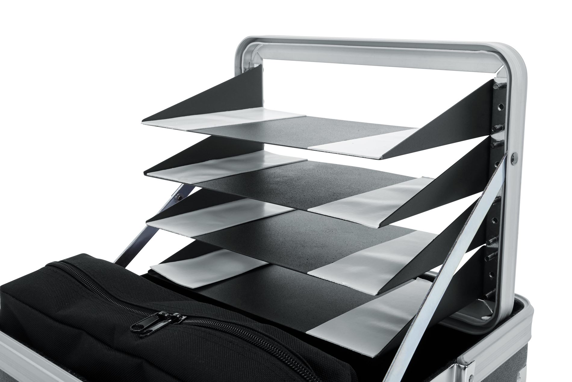 Za 4 brezžične sisteme Robustna polietilenska konstrukcija 4 police za pol stojala z dvostranskim lepilnim trakom 4 držala za mikrofon/telesni paket pod pokrovom Žep za dodatno opremo Zavit pokrov iz pene Ojačani kromirani vogali Vdolbene kromirane zapahe Notranjost, obložena s preprogo Zgornji ročaj za nošenje Gumijaste nogice