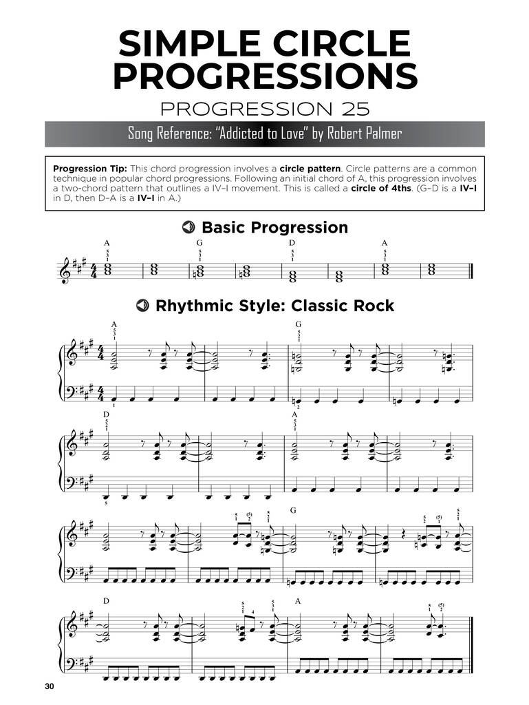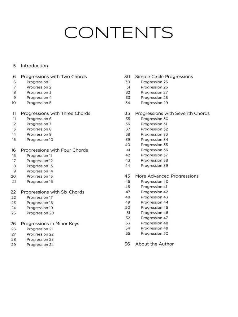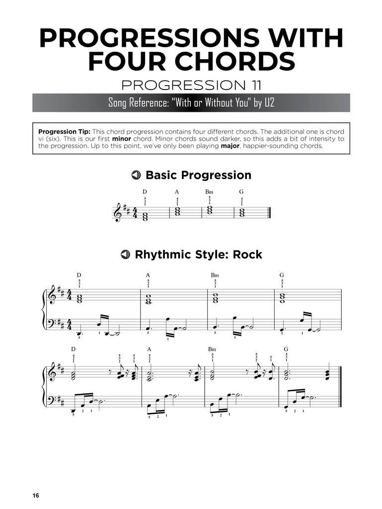 Edinstvena zbirka nepogrešljivih akordnih progresij, ki se uporabljajo v popu, rocku, hip-hopu, R&B-ju, jazzu in gospelu. Če ste na klavirju začetnik, vam bo ta knjiga omogočila, da boste akordna zaporedja igrali hitreje kot kdajkoli prej. Vključuje notni zapis, simbole akordov, koristne nasvete in spletne zvočne posnetke za demonstracijo.